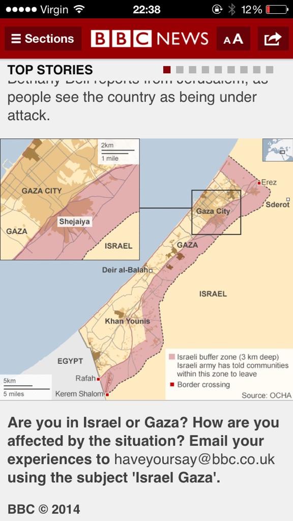 27 Jul 2014 BBC:”Israel army has told communities within 3km b… 0 likes BBC:”Israel army has told communities within 3km buffer zone to leave”- how does that work? Gaza is only 6km wide! http://t.co/RHKv5whPoG