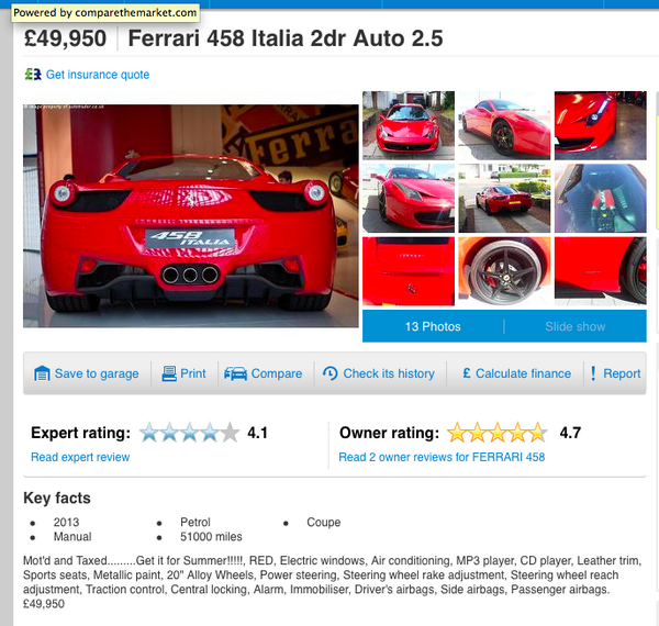 17 Jul 2014 #Ferrari 458 for sale for £50k? ….. .. . . . . …. 0 likes #Ferrari 458 for sale for £50k? ….. .. . . . . . . . … . . . . … …its a replica tho….lol- but a v good one! http://t.co/zrKn2ZO6XW